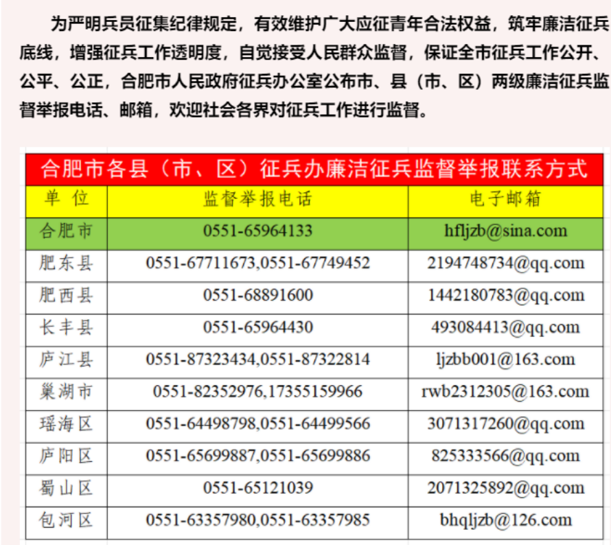 合肥市廉潔征兵監督舉報電話及郵箱公布