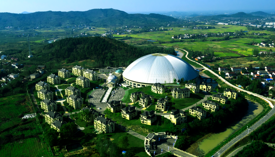 國軒溫泉宮為集體影視拍攝、溫泉養生、室內水上世界于一體的綜合文化休閑項目。布局為“天圓地方”,其中溫泉宮殼體跨度直徑為138米,目前屬亞洲最大直徑的殼體建筑。整體項目既體現了地中海式風格,更有星球天體夢幻之魅;既有各類養生溫泉池,也有大型室內溫泉沖浪池;既有高端商務類客房80間,也有水上兒童樂園,以及大型假山、木制演出舞臺等。